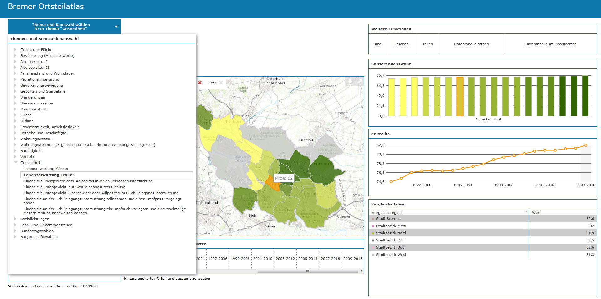 Abbildung: Screenshot des Bremer Ortsteilatlasses // Die Karte zeigt die Lebenserwartung der Frauen in den Bremer Stadtteilen. Ausgewählt ist der Stadtteil Mitte, für den rechts die Entwicklung in der Zeitreihe angezeigt wird. Links ist die Aus-wahl der Themen und Indikatoren zu sehen.