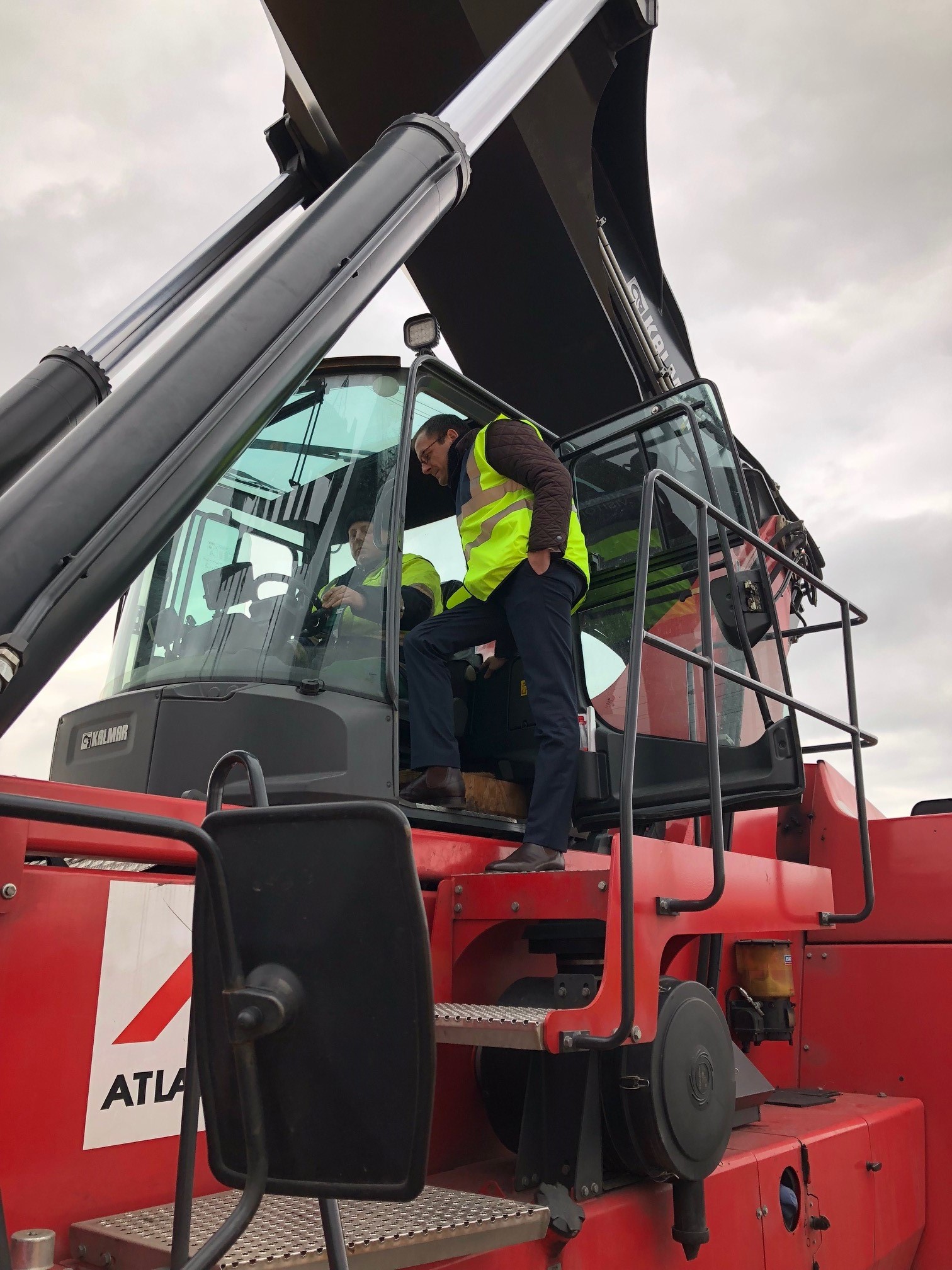Auf dem Außengelände der Atlantik Hafenbetriebe hatte Senator Martin Günthner die Möglichkeit, einem der Containerstaplerfahrer des Unternehmens über die Schulter zu schauen.