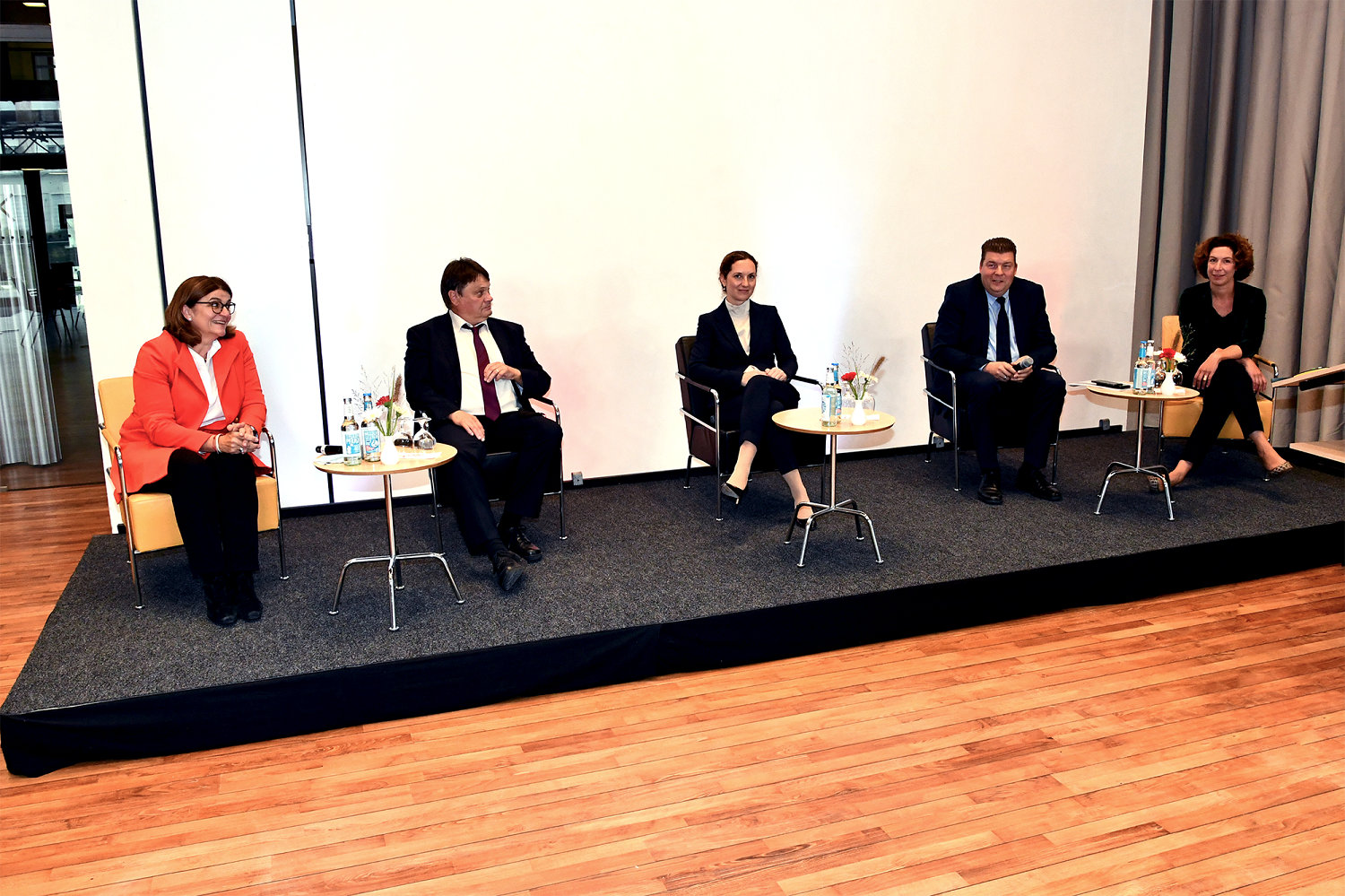 Auf dem Podium (v.l.n.r.): Verena Göppert, Finanzsenator Dietmar Strehl, Vanessa Wilke (Moderatorin), Finanzsenator Dr. Andreas Dressel und Kristina Jeromin. Foto: Finanzressort