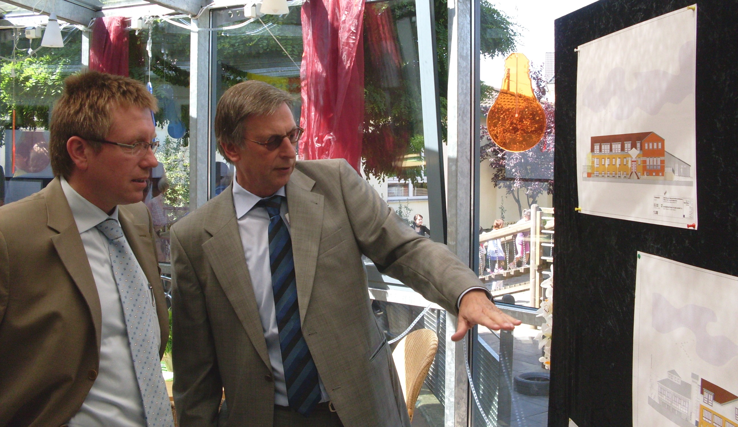 Beratung am Bauplan: Staatsrat Dr. Schuster und der Vorsitzende des Nachbarschaftshauses, Peter Sakuth