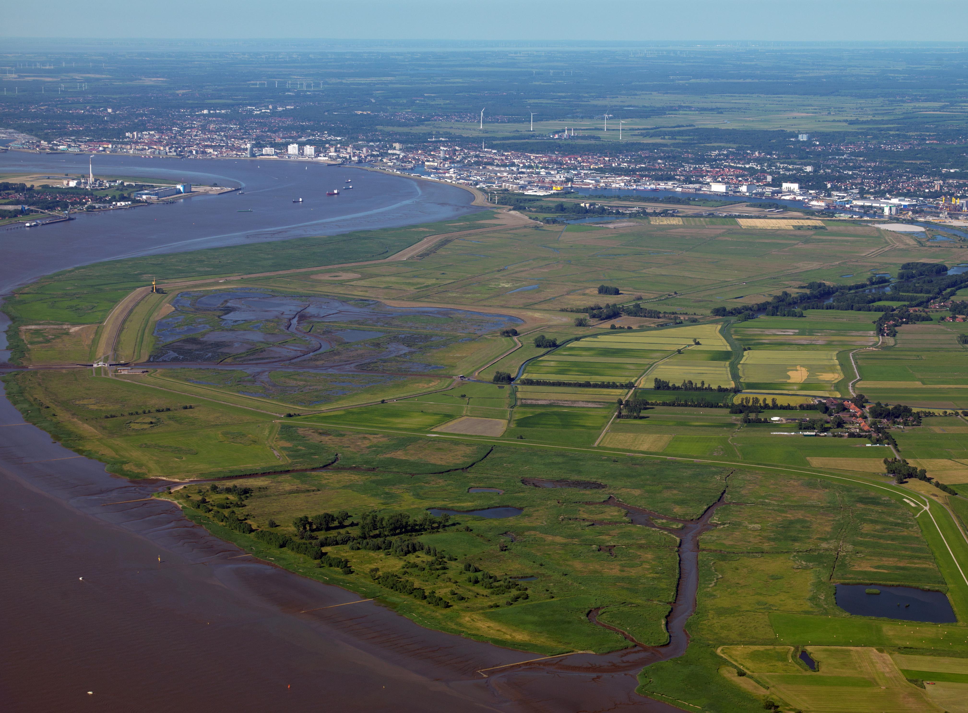 Blick auf die Luneplate: Wo früher intensiv Landwirtschaft betrieben wurde, ist ein Naturparadies entstanden. Die weitläufigen Flächen dienen dem ökologischen Ausgleich für die Eingriffe, die mit dem Hafenbau in Bremerhaven verbunden sind.