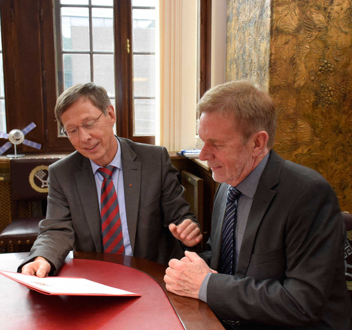 Bürgermeister Carsten Sieling überreicht dem Ortsamtsleiter Ingo Funck nach knapp 46 Dienstjahren seine Abschiedsurkunde