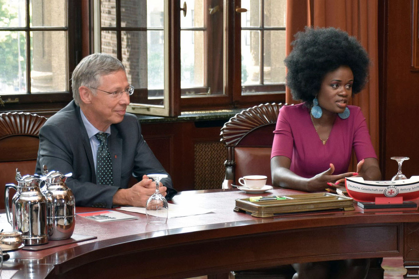Bürgermeister Carsten Sieling und Stella Agara während des Pressetermins im Rathaus
