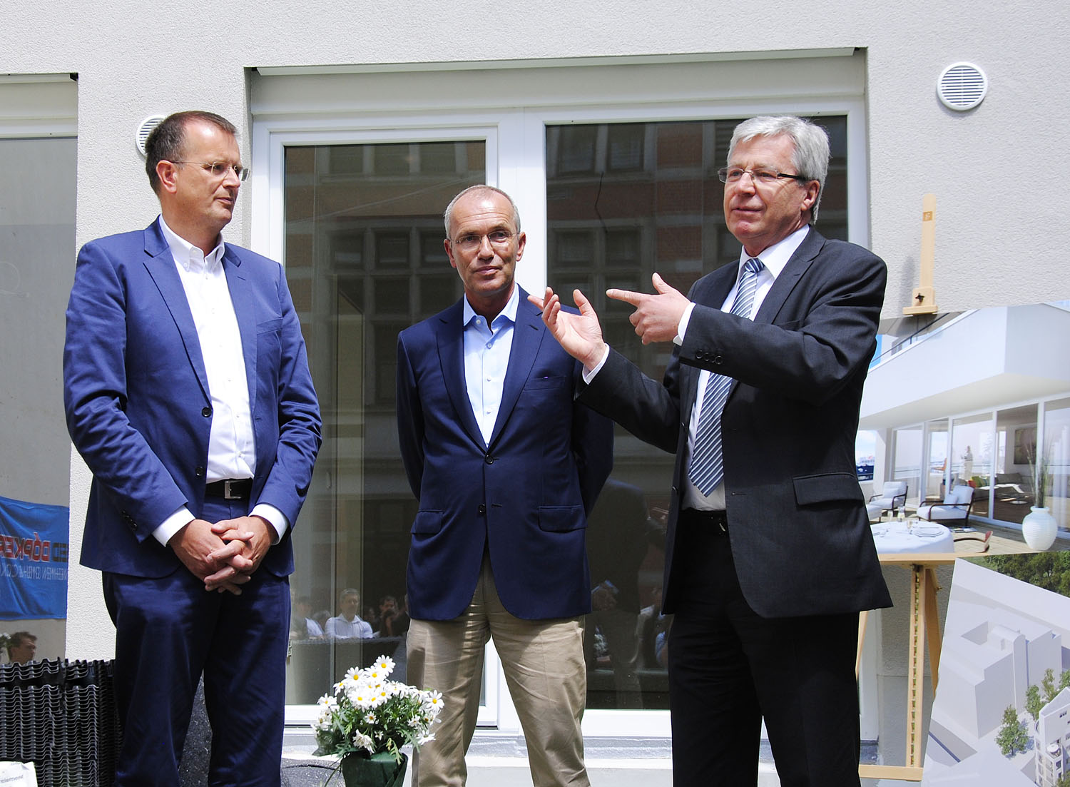 Bürgermeister Jens Böhrnsen freut sich mit den beiden Justus Grosse-Gesellschaftern Joachim Linnemann und Clemens Paul über neue Wohnungen für Bremen