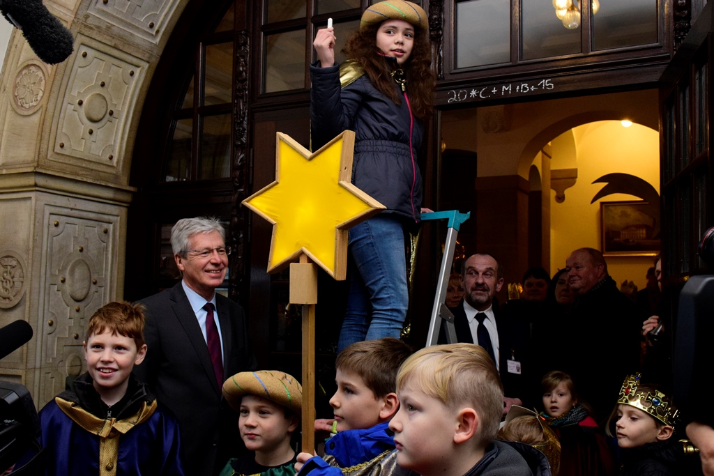 Bürgermeister Jens Böhrnsen freut sich über den Segen an der Bremer Rathauspforte: 20*C+M+B+15 - "Christus segne dieses Haus" (Latein "Christus mansionem benedicat")