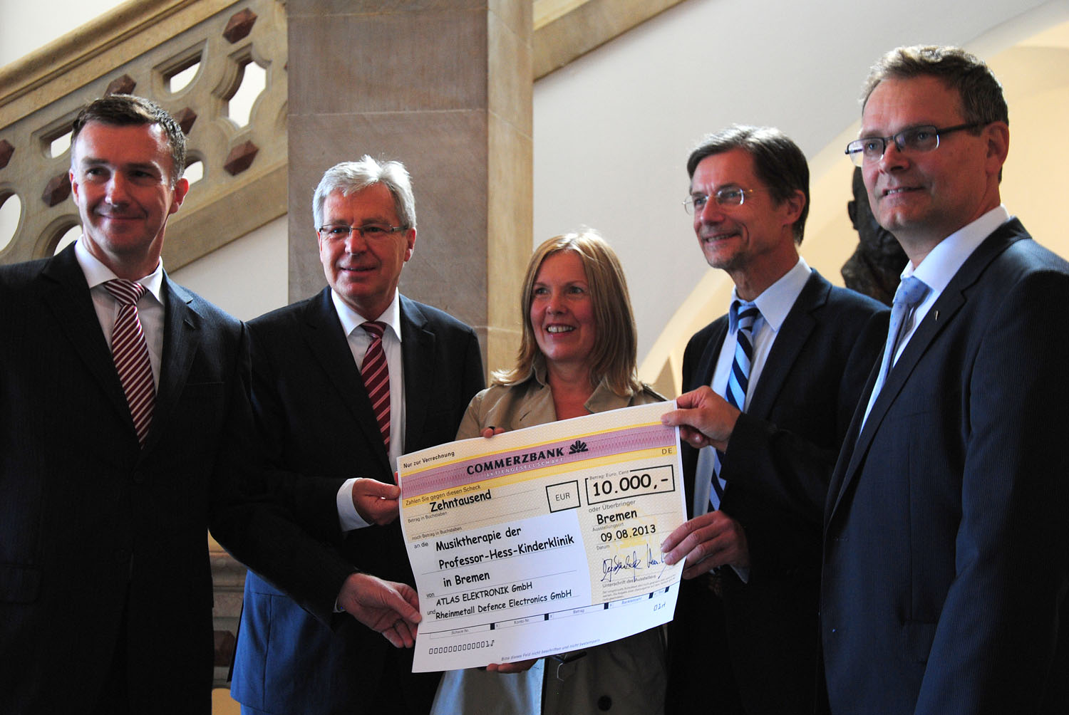 Bürgermeister Jens Böhrnsen überreicht Prof. Dr. Hans-Iko Huppertz (2. v. r.) und Anne Bolte den Spendenerlös von 10.000 Euro. Mit anwesend waren Hans-Heinrich Meyer, Rheinmetall Elektronik (r.) und Dr. Oliver Juckenhöfel, Atlas Elektronik (l.)