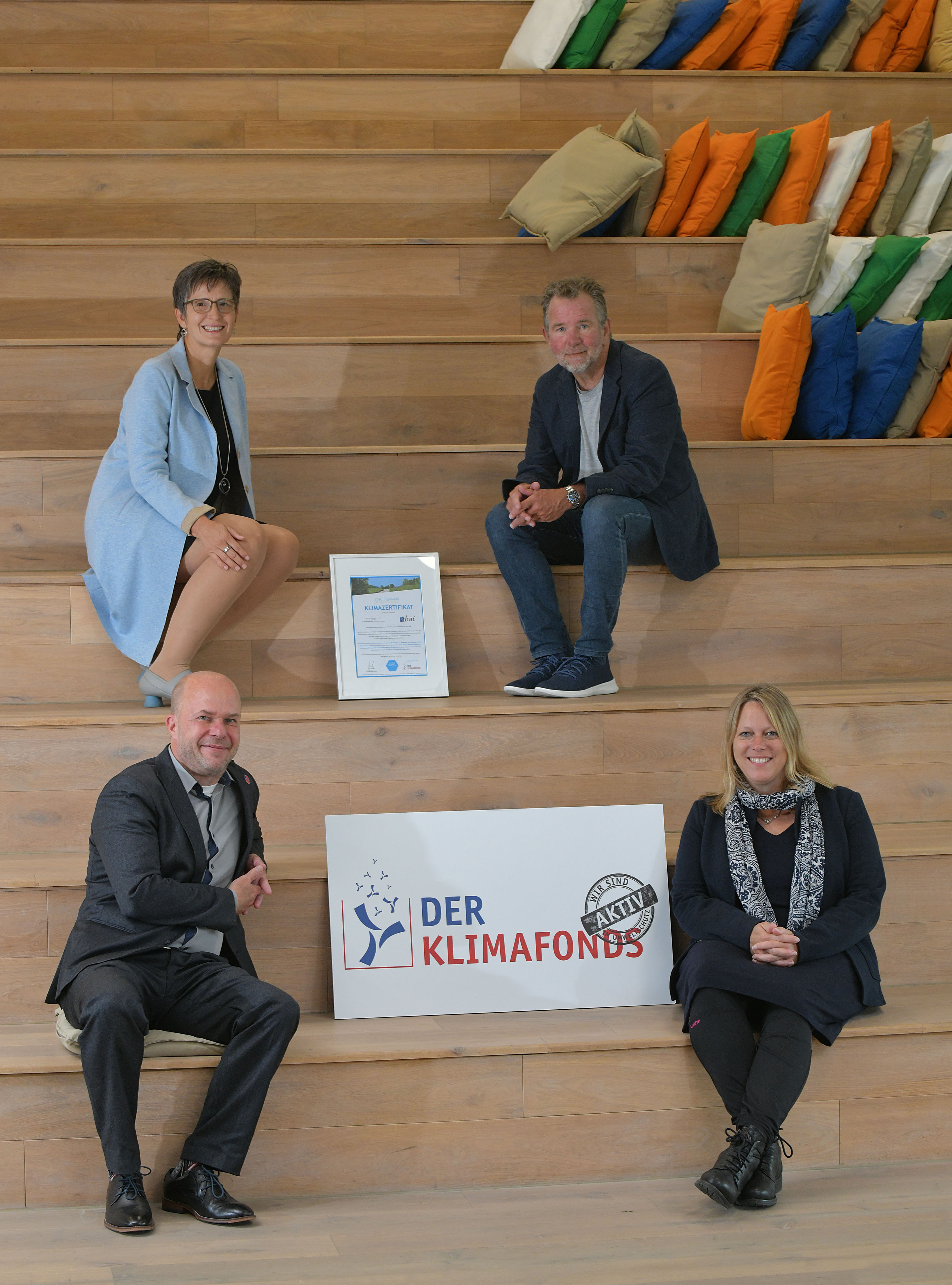 Bürgermeisterin sowie Klimaschutz- und Umweltsenatorin Dr. Maike Schaefer (unten rechts) freut sich gemeinsam mit Martin Schulze (unten links) von der Geschäftsstelle Umwelt Unternehmen und den abat Vorständen Gyde Wortmann und Hinrich Meisterknecht über den Beitrag der abat AG für den „Klimafonds“. ©PUU_Bahlo