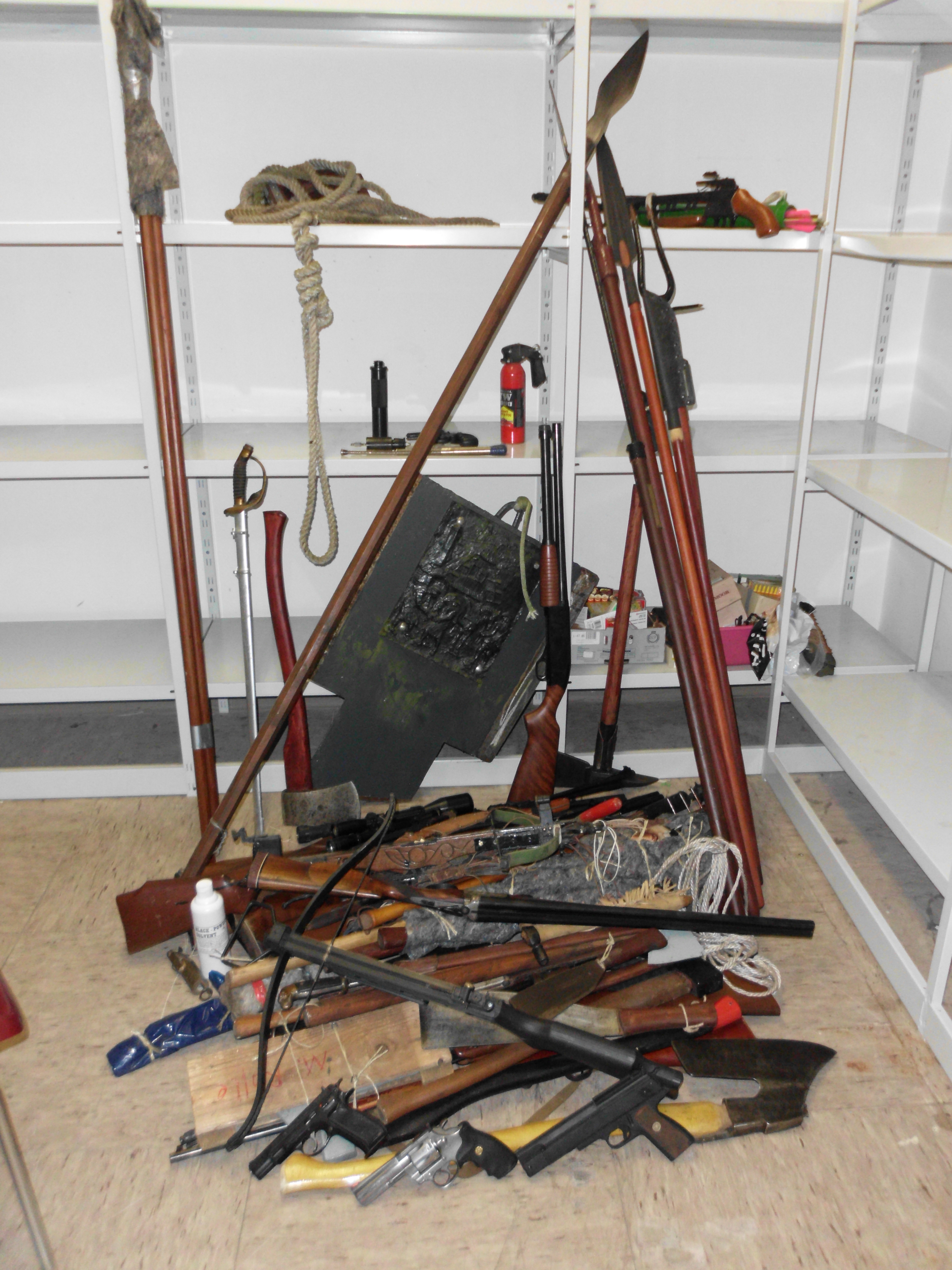 Das Bild zeigt einen Teil der sichergestellten Waffen und Gegenstände