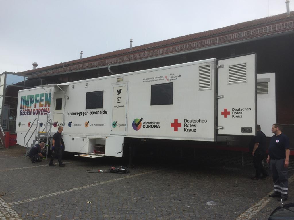Vor einer Lagerhalle steht der Auflieger des DRK-Impfmobils und wird für den Einsatz vorbereitet: Eine Leiter wird befestigt und Kabel verlegt. Foto: Herwig Renkwitz (DRK)