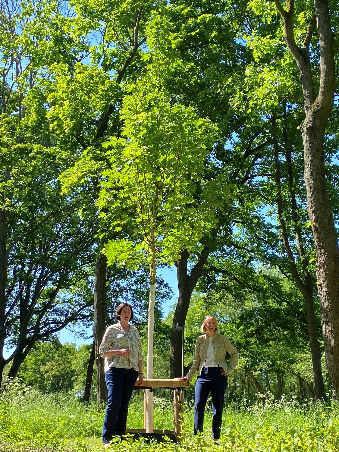 Davon wird es in Bremen bald schon mehr geben: Neu gepflanzte Bäume. Umweltsenatorin Kathrin Moosdorf (links) und die Geschäftsführerin des Umweltbetrieb Bremen, Viola Hellwag, in der Franz-Schütte-Allee. Foto: Umweltressort