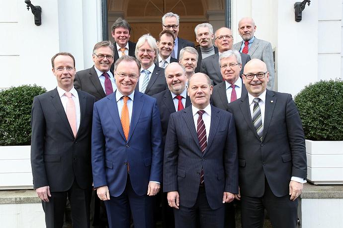 Der Chef der Staatskanzlei von Mecklenburg-Vorpommern, Staatssekretär Christian Frenzel (vorne, von links nach rechts), Niedersachsens Ministerpräsident Stephan Weil, Hamburgs Erster Bürgermeister Olaf Scholz , Schleswig-Holsteins Ministerpräsident Torsten Albig und Bremens Bürgermeister Jens Böhrnsen (2. Reihe rechts) beim Treffen im Gästehaus des Senats in Hamburg gemeinsam mit Gewerkschaftsvertretern.