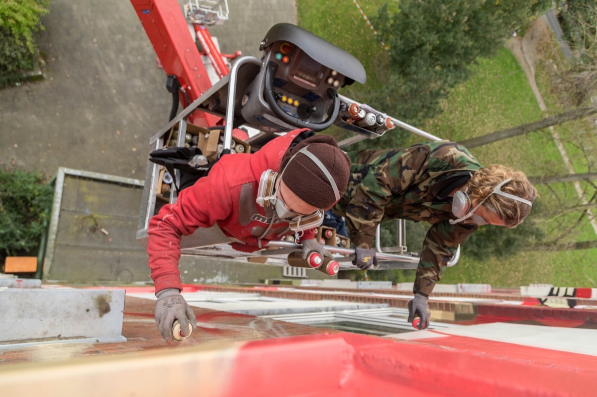 Der Graffity-Künstler Kosta Jakson (li.) zusammen mit einem Helfer bei der Arbeit