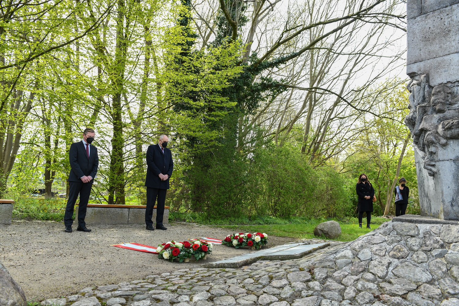 Der Präsident der Bremischen Bürgerschaft, Frank Imhoff, und der Präsident des Senats, Bürgermeister Dr. Andreas Bovenschulte, gedenken still am Denkort Bunker "Valentin" in Bremen-Nord.