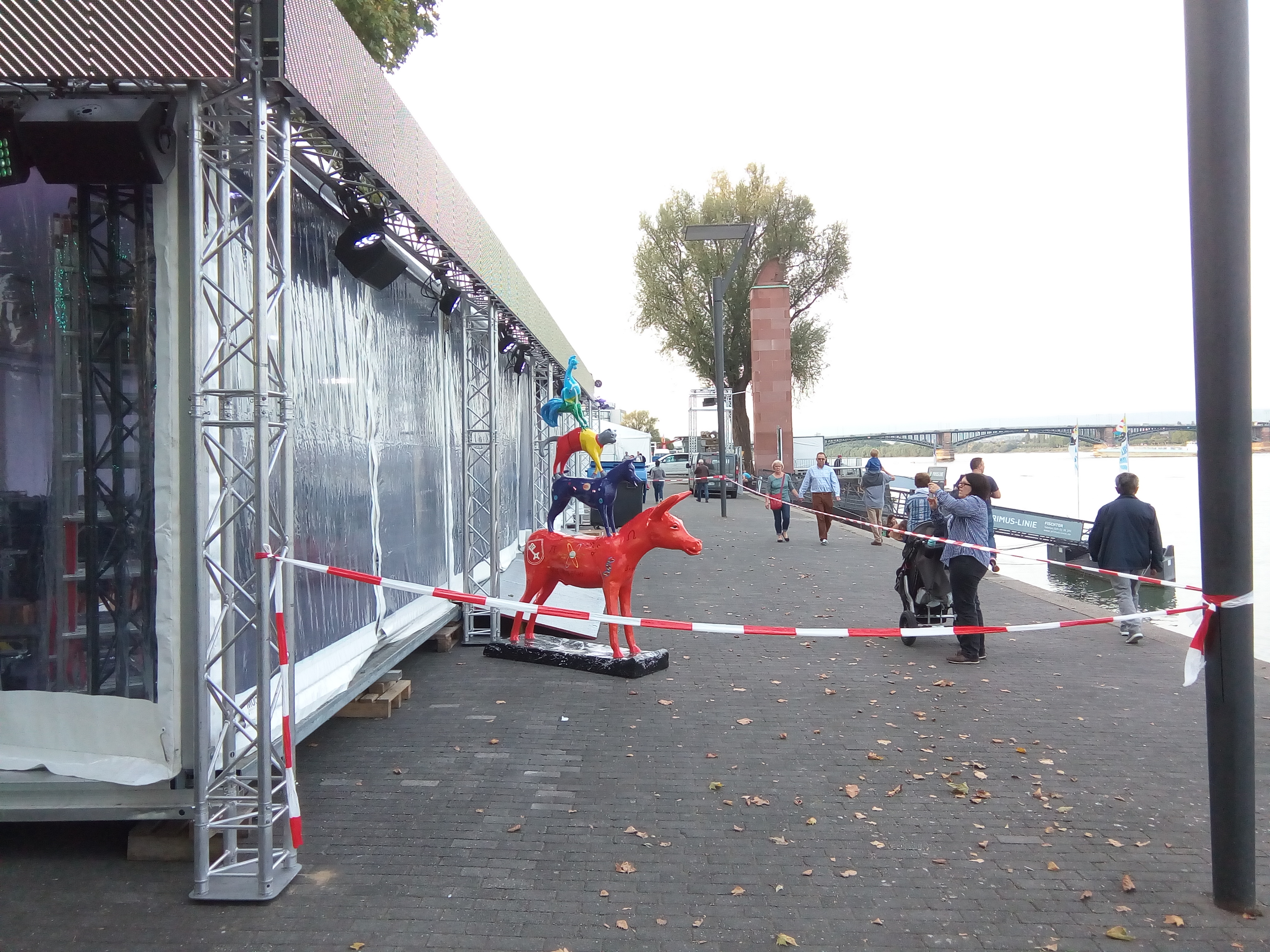 Die Ländermeile am Rheinufer in Mainz im Aufbau, hier das Bremenzelt mit der Stadtmusikanten-Figur. Am 2. und 3. Oktober werden in der rheinland- pfälzischen Landeshauptstadt rund 500.000 Besucher erwartet.