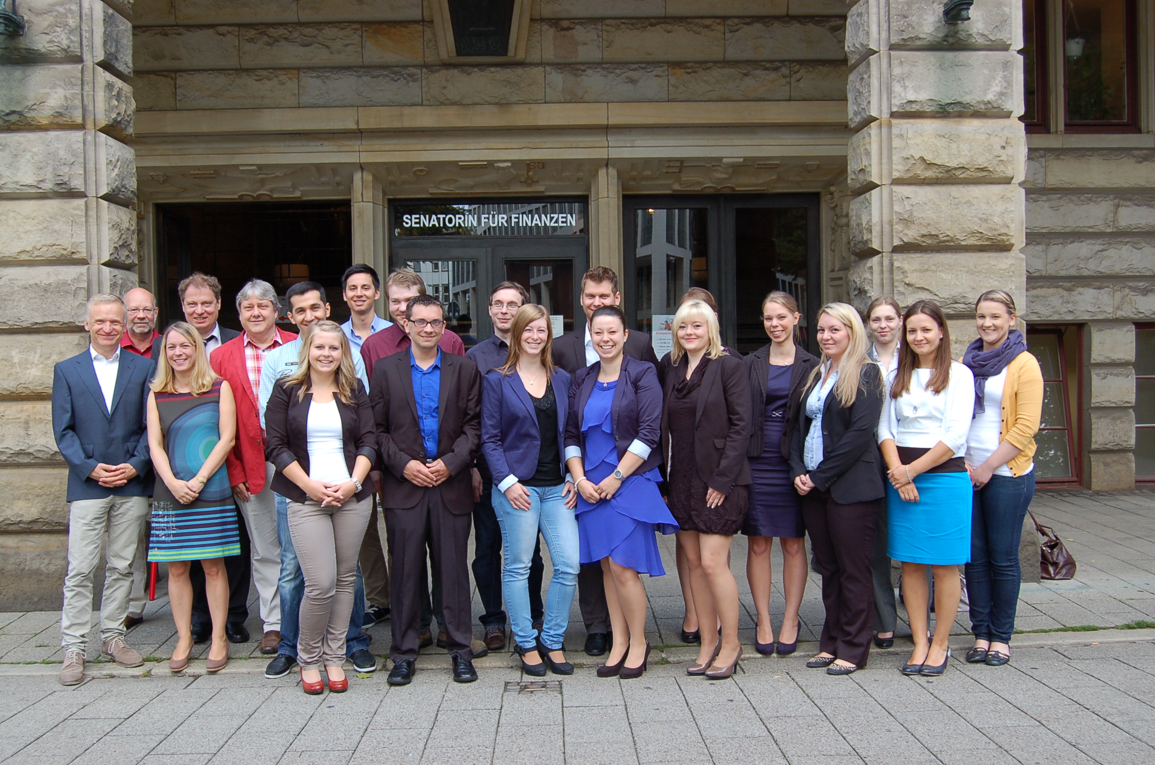 Die neuen Finanzwirtinnen und Finanzwirte zusammen mit Dr. Dirk Schwieger (vierter von links) und Ausbildern