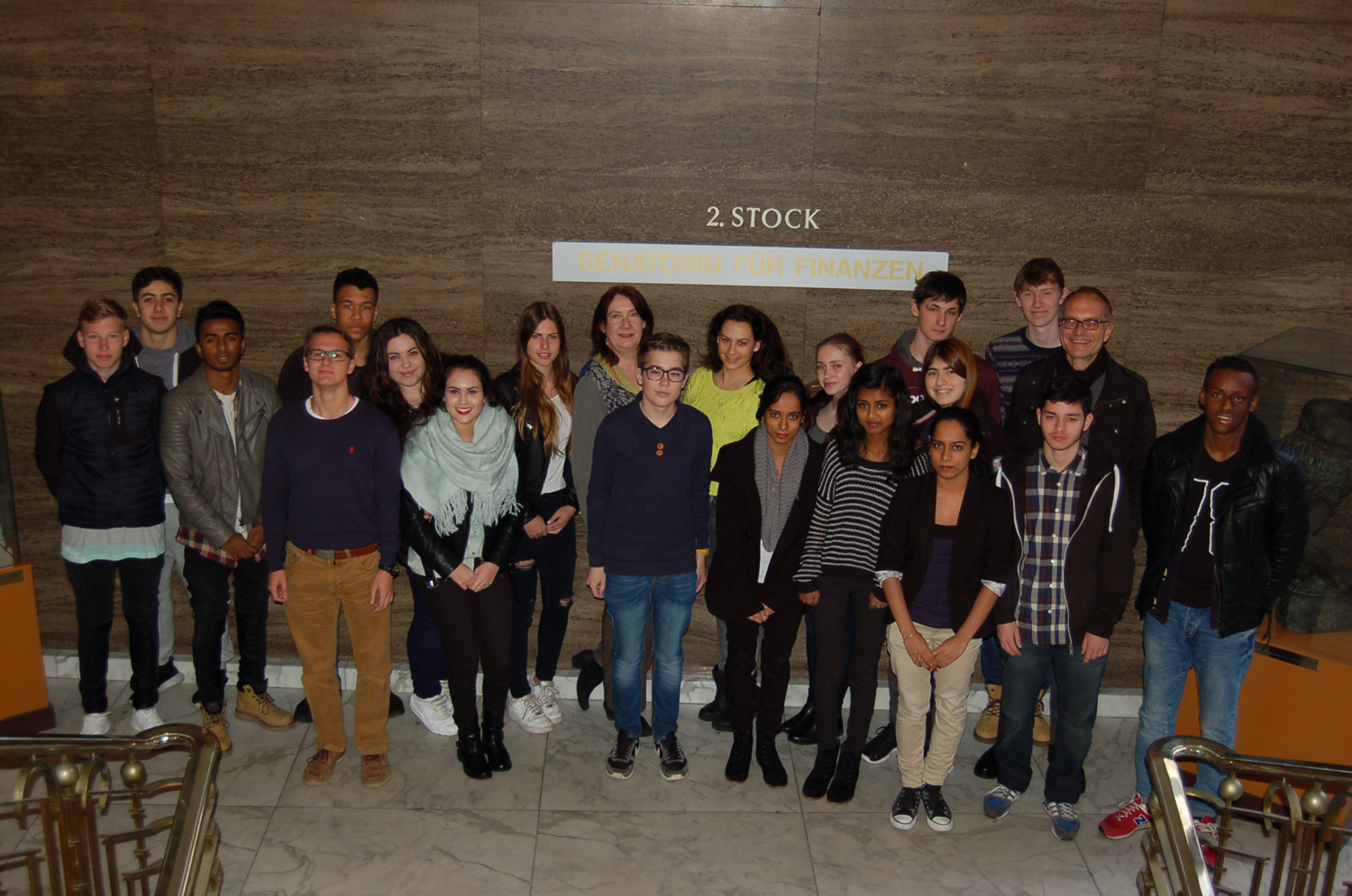 Die Obervielander Schülerinnen und Schüler mit Finanzsenatorin Karoline Linnert und Lehrer Ulrich Maas im Treppenhaus im "Haus des Reichs" am Rudolf-Hilferding-Platz, dem Dienstsitz der Finanzsenatorin