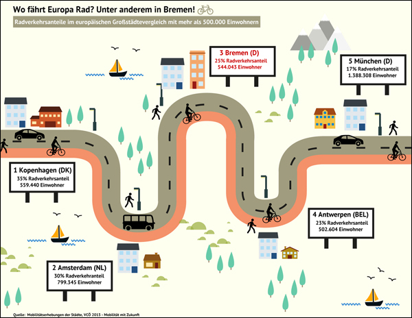 Die Stadt Bremen ist unter europäischen Großstädten mit mehr als 500.000 Einwohnern die Stadt mit dem dritthöchsten Radverkehrsanteil. Quelle: bremen.online GmbH/MEL