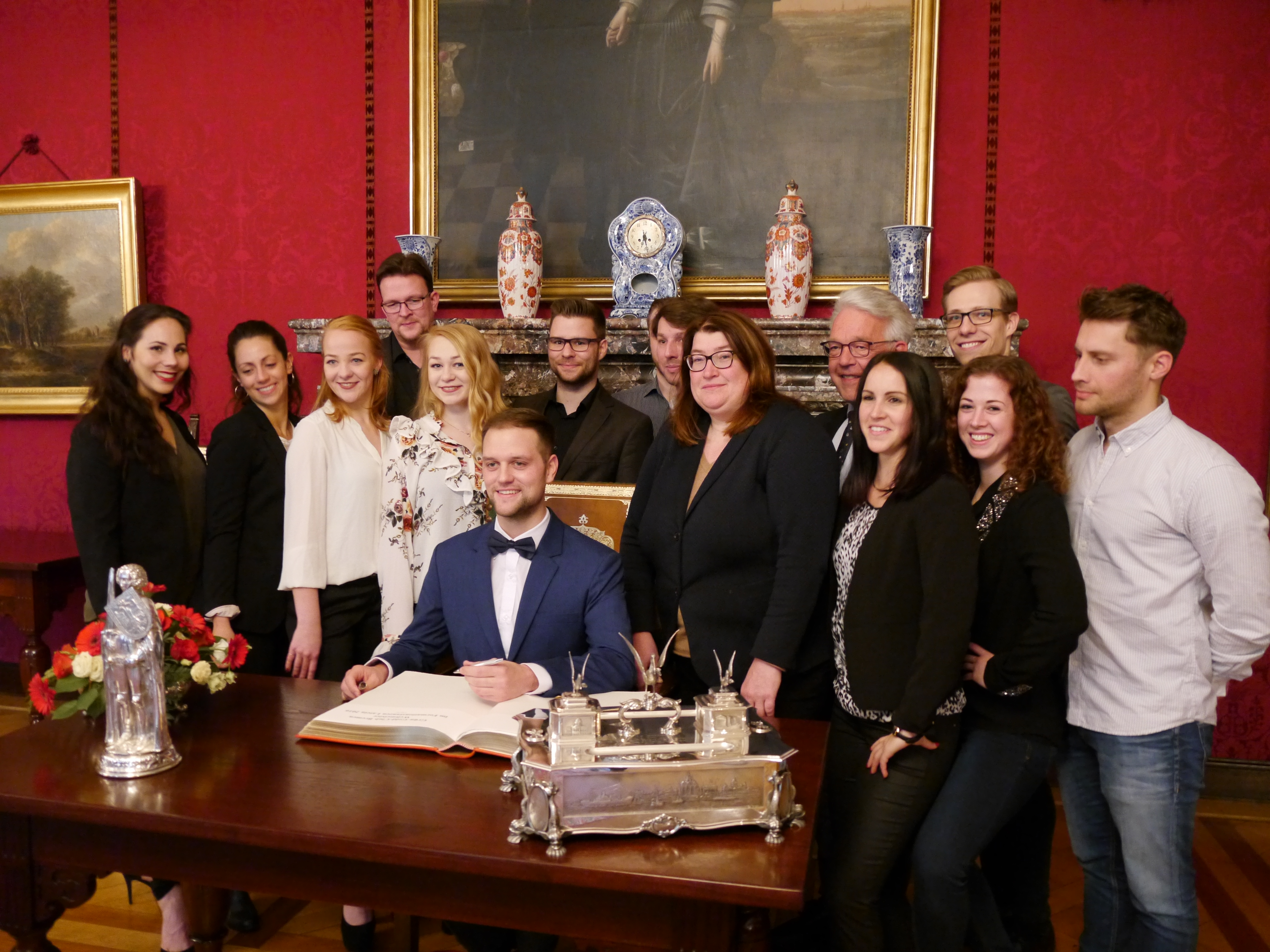Die Tänzerinnen und Tänzer vom Grün-Gold-Club tragen sich in das Goldene Buch Bremens ein
