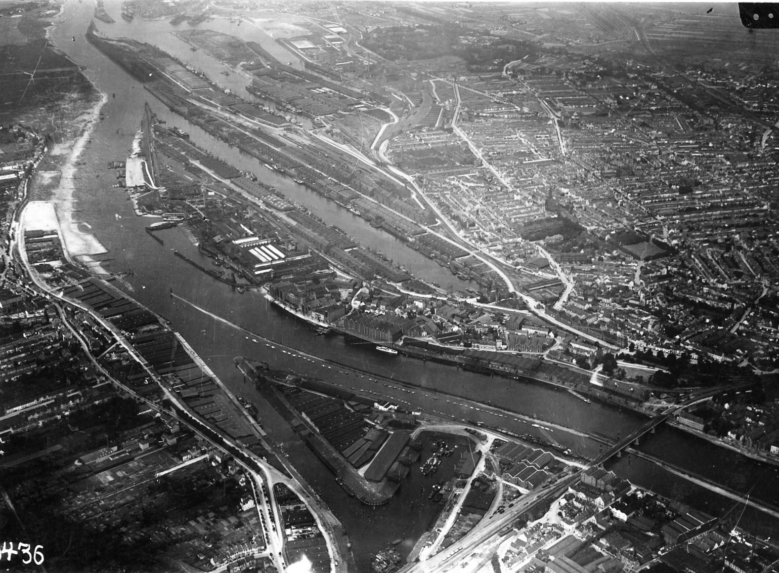 Ein Blick über die bremischen Hafenanlagen, wie sie sich Mitte der 1920-er Jahre darstellten: Links unten erkennen wir den Hohentorshafen, dessen Gleisanlagen gut auszumachen sind. Der Weserbahnhof – rechts unten vor der Stephani-Eisen-bahnbrücke zu sehen – hat noch keine Stahlspundwand erhalten und der Blick auf das Areal von Europa- und Überseehafen verrät, dass sowohl die Kajen- als auch die Gleisanlagen gut ausgelastet sind.