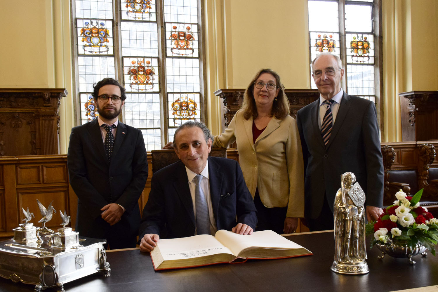 Eintrag in das Goldene Buch: Generalkonsul Erwan Varas Dulac, Botschafter Patricio Pradel Elgueta, Bürgermeisterin Karoline Linnert und der Doyen des Konsularkorps Bremen, Honorarkonsul Volker Kröning (v.l.)