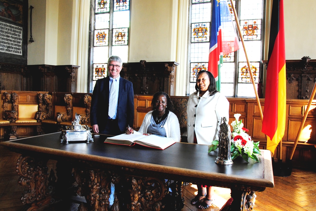 Eintrag in das Goldene Buch: Senator Dr. Hermann Schulte-Sasse, Bürgermeisterin Agnes Kafula und ihre Vorgängerin Elaine Trepper