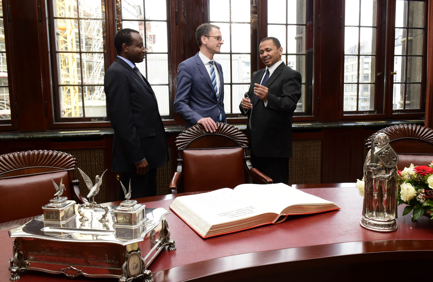 Eintrag in das Goldene Buch (v.l.n.r.): Simeon Uulenga, Gesandter des Botschaftsrates, Senator Martin Günthner und Botschafter Andreas Guibeb