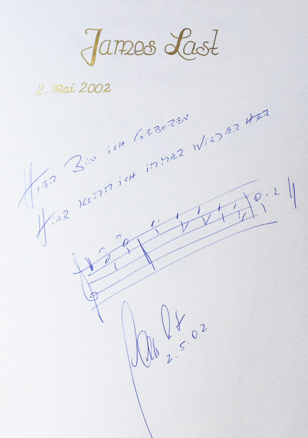 Eintrag von James Last im Goldenen Buch der Freien Hansestadt Bremen : Hier bin ich geboren - Hier komm ich immer wieder her. Foto: Senatspressestelle / Anja Raschdorf