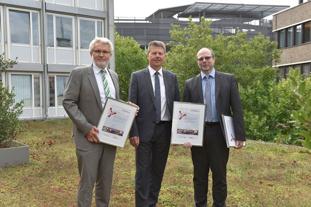 Fototermin auf dem Gründach: Bremens Umweltsenator Dr. Joachim Lohse zeichnet AOK Bremen/Bremerhaven und Werkstatt Bremen für ihre CO2-Einsparungen als Klimaschutzbetriebe aus.