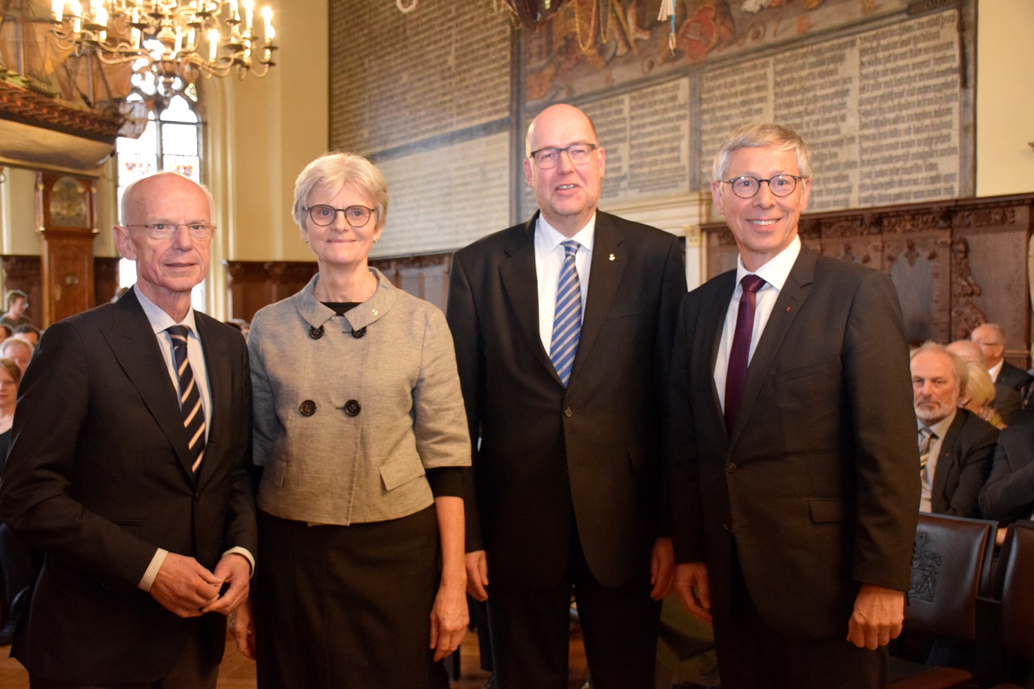 Gastgeber und Gastredner bei dem Senatsempfang in der Oberen Rathaushalle anlässlich 500 Jahre Reformation: Bürgerschaftspräsident Christian Weber, Präsidentin Edda Bosse, Schriftführer der BEK Pastor Renke Brahms und Bürgermeister Carsten Sieling (v.l.)