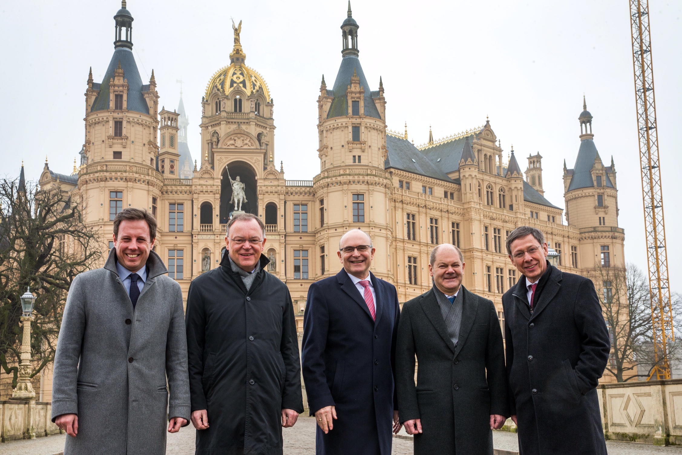 Gruppenbild am Schweriner Schloss (v.re.): Dr. Carsten Sieling, Präsident des Senats und Bürgermeister der Freien Hansestadt Bremen, Olaf Scholz, Erster Bürgermeister der Freien und Hansestadt Hamburg, Erwin Sellering, Ministerpräsident Mecklenburg-Vorpommern, Stephan Weil, Ministerpräsident Niedersachsen und Thomas Losse-Müller, Chef der Staatskanzlei Schleswig-Holstein (als Vertreter für Ministerpräsident Torsten Albig)