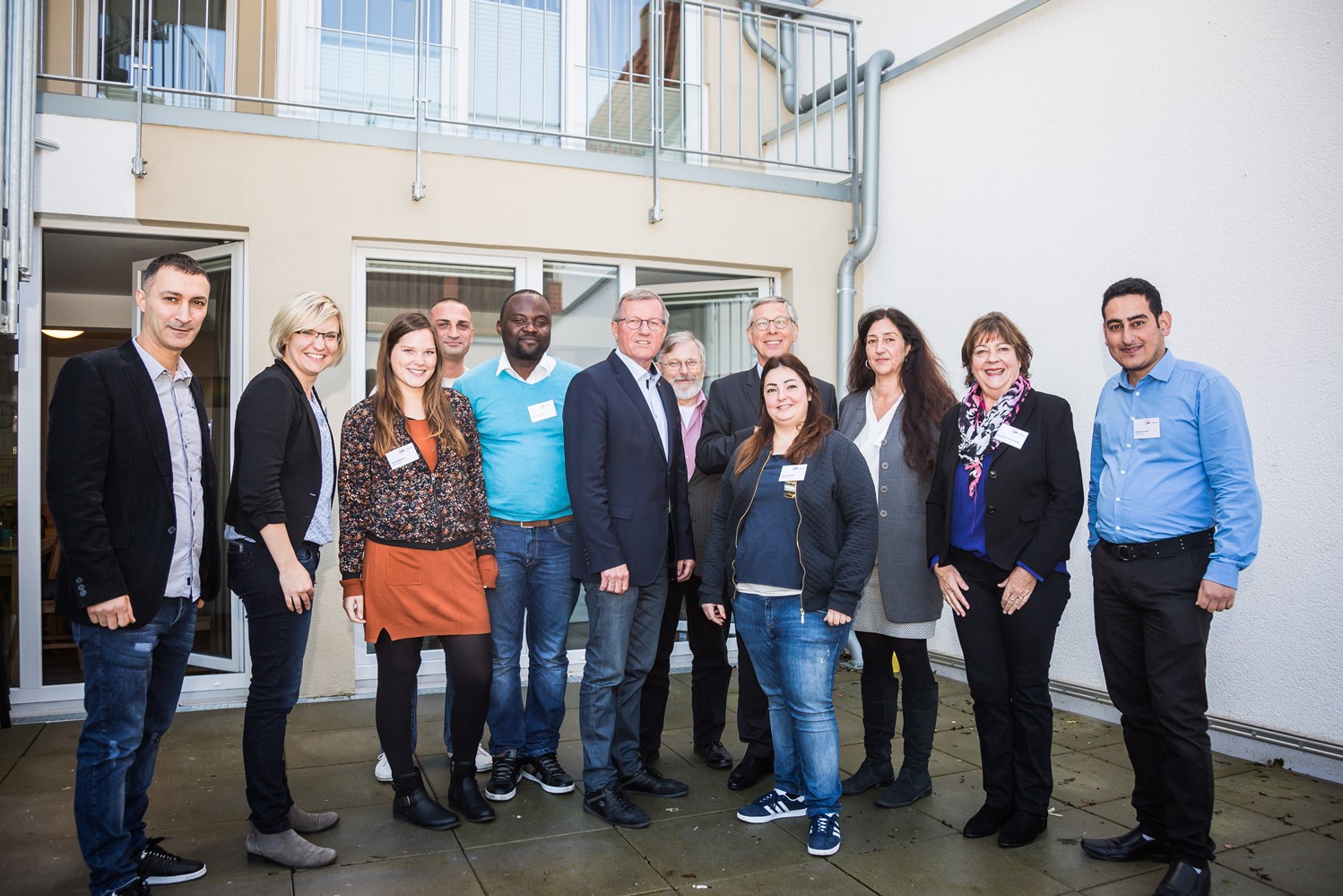 Gruppenbild mit Bürgermeister Sieling (vlnr.): Özgür Cömert (kommissarische Teamleitung JWG Buntentor, AWO Bremen), Larissa Krümpfer (Präsidiumsmitglied AWO Bremen), drei Teammitglieder der JWG Buntentor (AWO Bremen), Wilhelm Schmidt (Vorsitzender des Präsidiums des AWO Bundesverbandes), Erich Kruschel (Stellv. Präsident der AWO Bremen), Carsten Sieling (Bürgermeister), Mitarbeiterin der JWG Buntentor (AWO Bremen), Sandra Grohnert (Fachbereichsleiterin Jugend, AWO Bremen), Eva-Maria Lemke-Schulte (Präsidentin AWO Bremen), Mitarbeiter der JWG Buntentor (AWO Bremen)