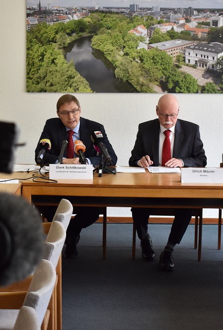 Innensenator Ulrich Mäurer (re.) und Dierk Schittkowski bei der Vorstellung des Verfassungsschutzberichtes 2018