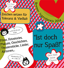 "Ist doch nur Spaß !" - Bremer Jugendpreis 2014: Alle Menschen sind frei und gleich an Würde geboren. Sie sind mit Vernunft und Wissen begabt und sollen einander im Geiste der Brüderlichkeit begegnen. (Artikel 1 der Allgemeinen Erklärung der Menschenrechte der Vereinten Nationen)