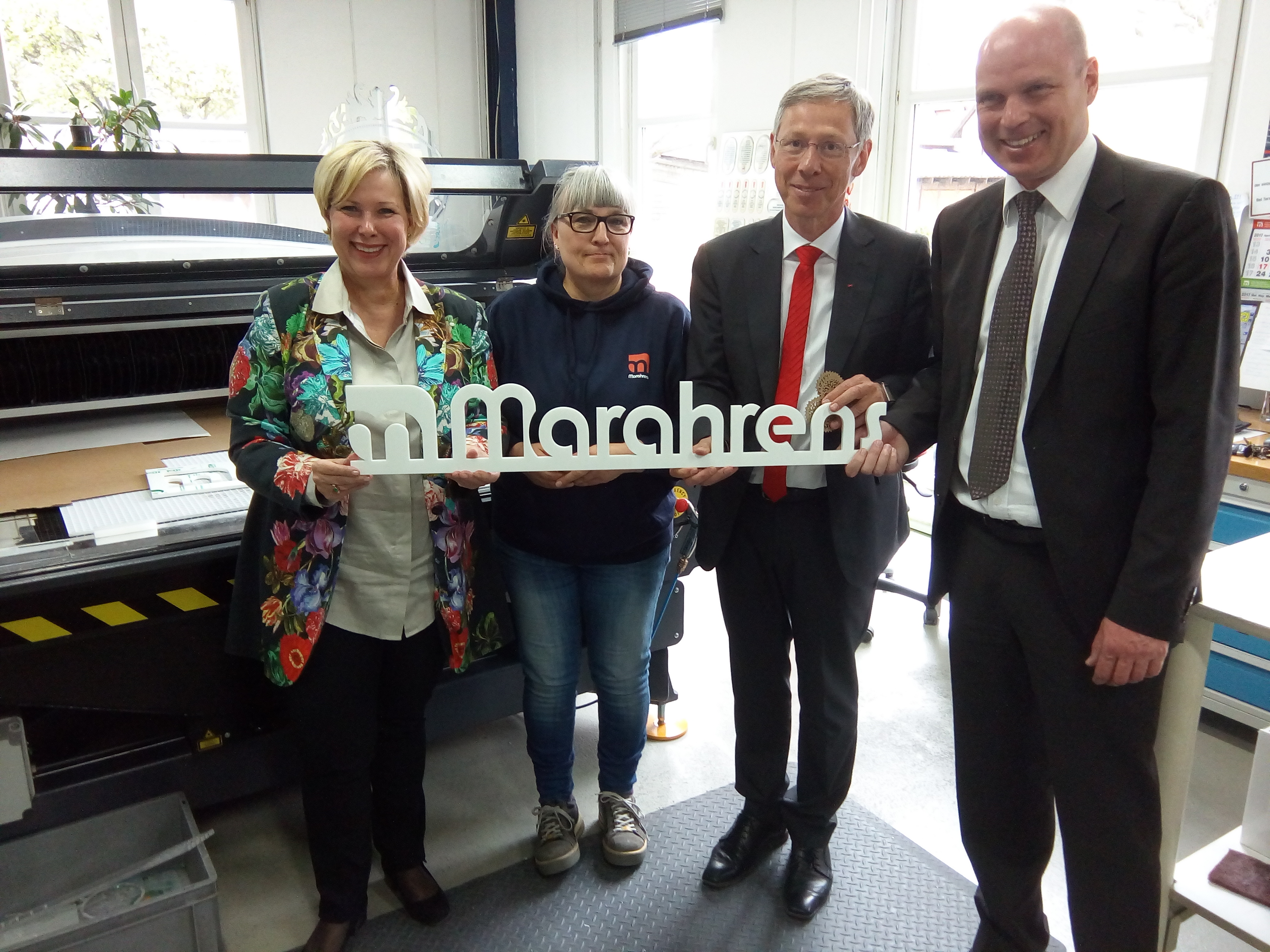Janina Marahrens-Hashagen (li.), Silke Janicki (zuständig für den Bereich Lasergravur) und Volker Ballhausen (re., Projektentwickler bei der WFB für den Standort Bremen-Nord) zusammen mit Bürgermeister Sieling