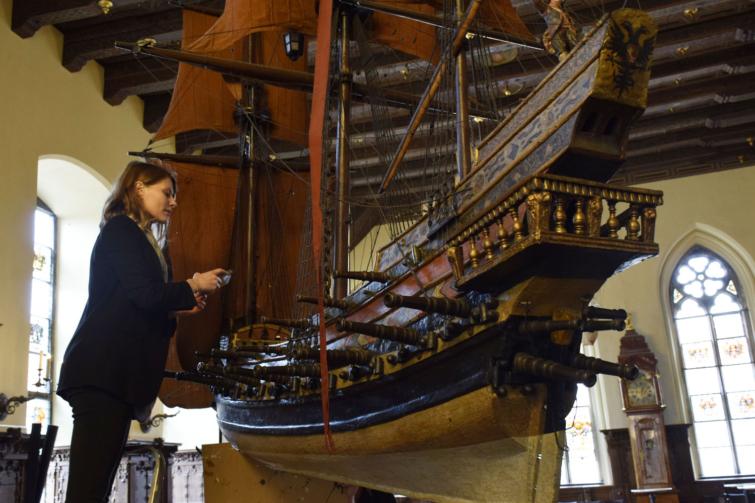Julia Binter (im Bild) ist die Kuratorin der Ausstellung "Der blinde Fleck. Bremen und die Kunst in der Kolonialzeit". Sie nahm die heutige Gelegenheit war, um für den Künstler Hew Locke einige Fotos von der Abhängung des Orlogschiffes aufzunehmen als Orientierung für die Hängung der "Cui bono" in der ersten Augustwoche. Foto: Senatspressestelle