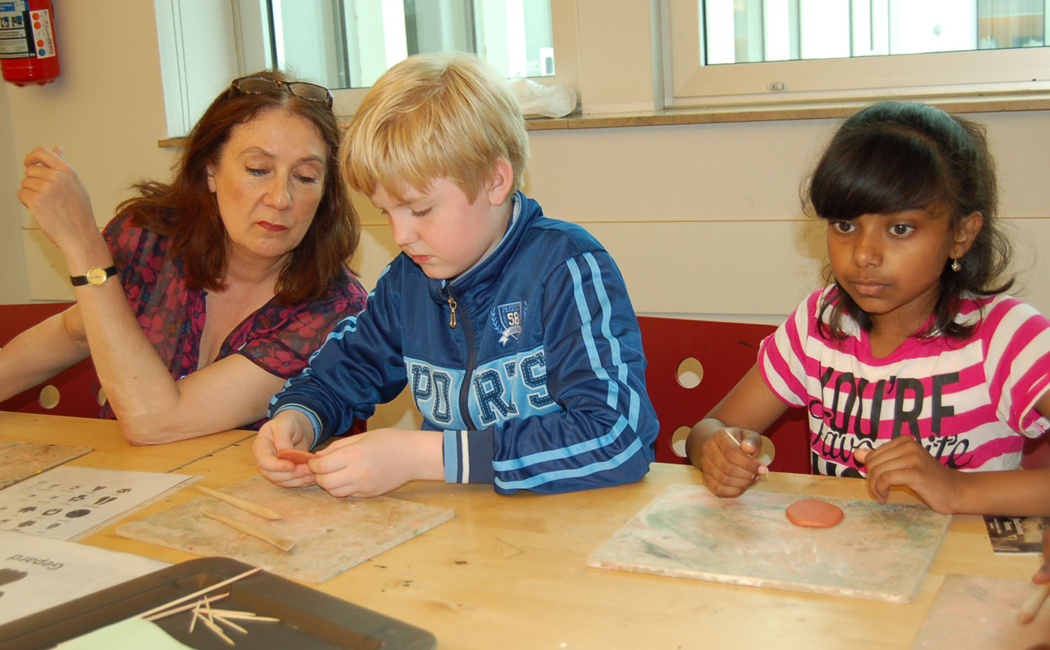 Karoline Linnert formt zusammen mit Schülern der Gazellenklasse den Tatzenabdruck eines Geparden nach