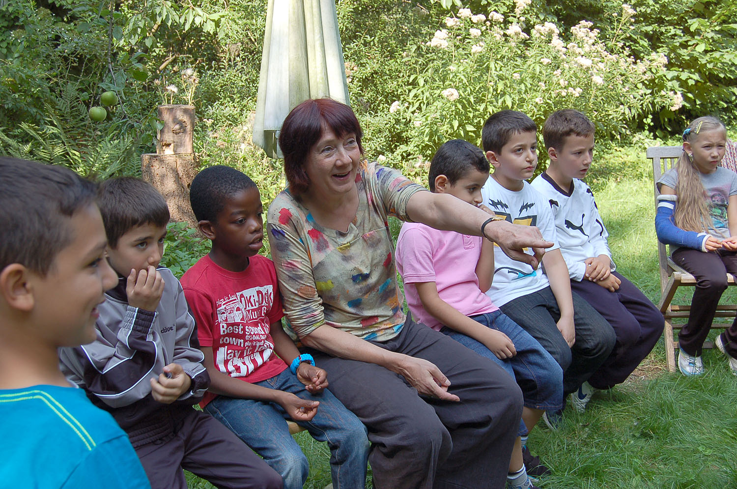 Karoline Linnert mit ihren Lesepaten auf der Parzelle