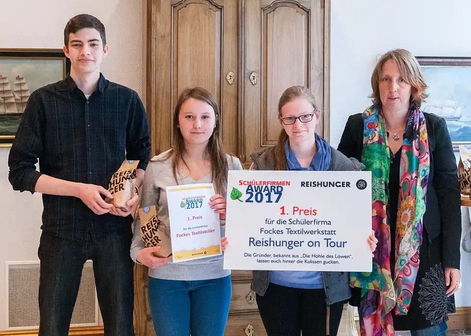 Köpfe von Fockes Werkstatt freuen sich über den Award (v.l.): Trystan Andrade Mendanha, Lisa Rieder, Nina Sundemann (alle aus der 9a) und Lehrerin Claudia Schleese