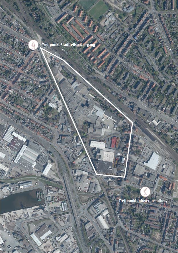 Luftbild mit der genauen Plangebietsmarkierung und den Treffpunkten für den Stadtteilspaziergang und die Infoveranstaltung (Quelle: BPW baumgart+partner)