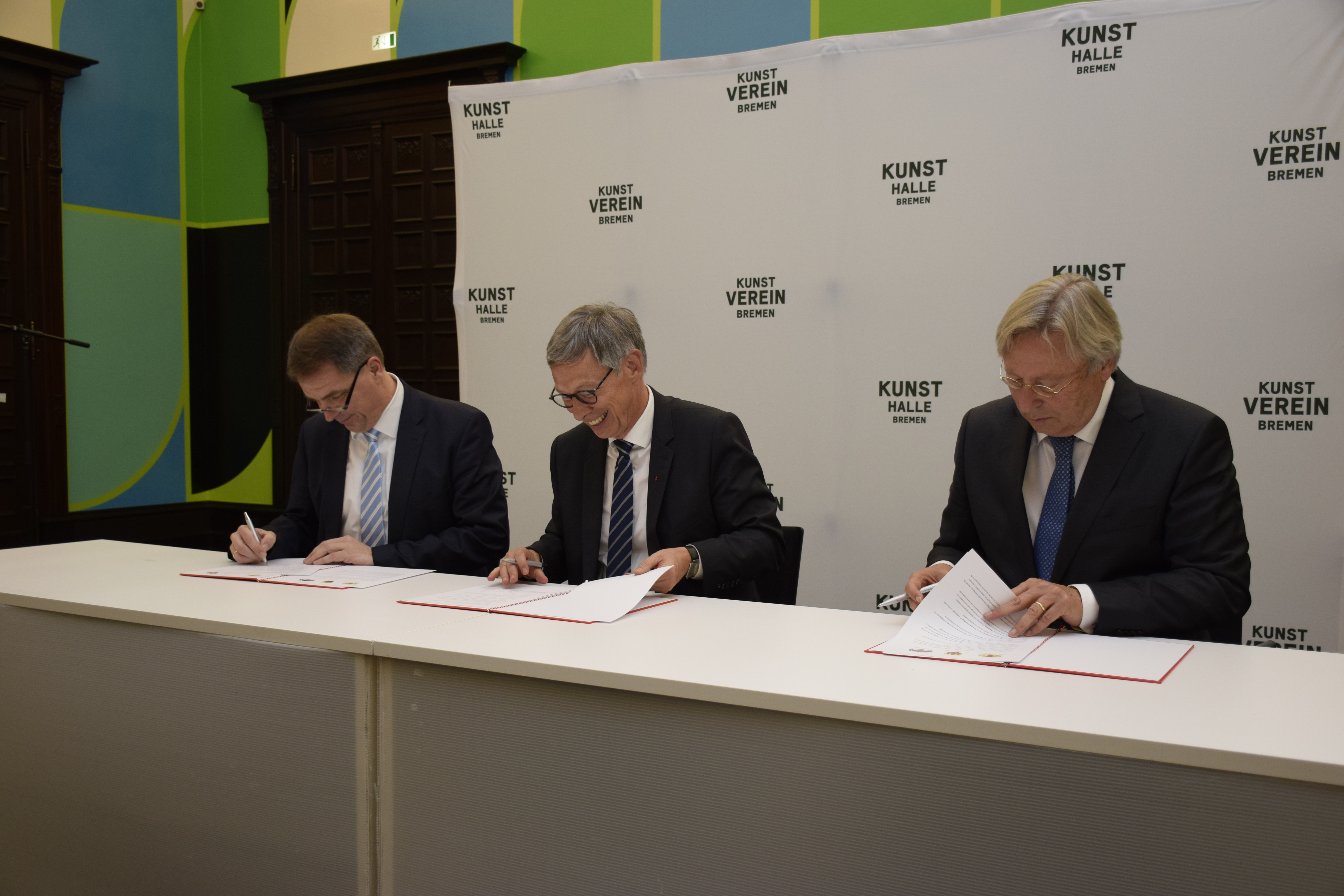 Man versteht sich gut: Peter den Oudsten, Carsten Sieling und Jürgen Krogmann (v.r.) unterzeichnen in der Kunsthalle Bremen die Absichtserklärung zur Intensivierung der Zusammenarbeit der Städte Bremen, Groningen und Oldenburg