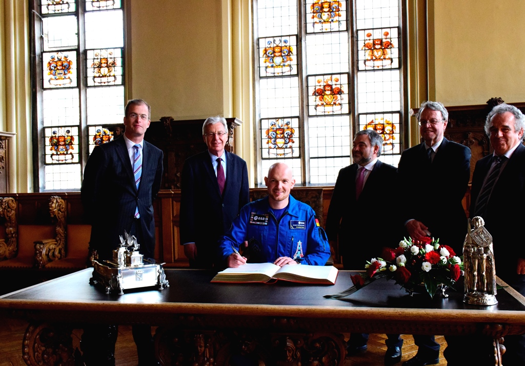 Mit Raumfahrt-Overall in der historischen Rathaushalle: Alexander Gerst beim Eintrag ins Goldene Buch. Mit im Bild (v.l.): Bart Reijnen, Airbus Defence & Space, Bürgermeister Böhrnsen, Hans-Georg Tschupke, Abteilungsleiter Innovation, Raumfahrt und Technologie bei der WfB Wirtschaftsförderung Bremen, Dr. Peter Vits, Raumfahrtkoordinator des Landes Bremen und Dr. Fritz Merkle, OHB Gruppe Bremen.