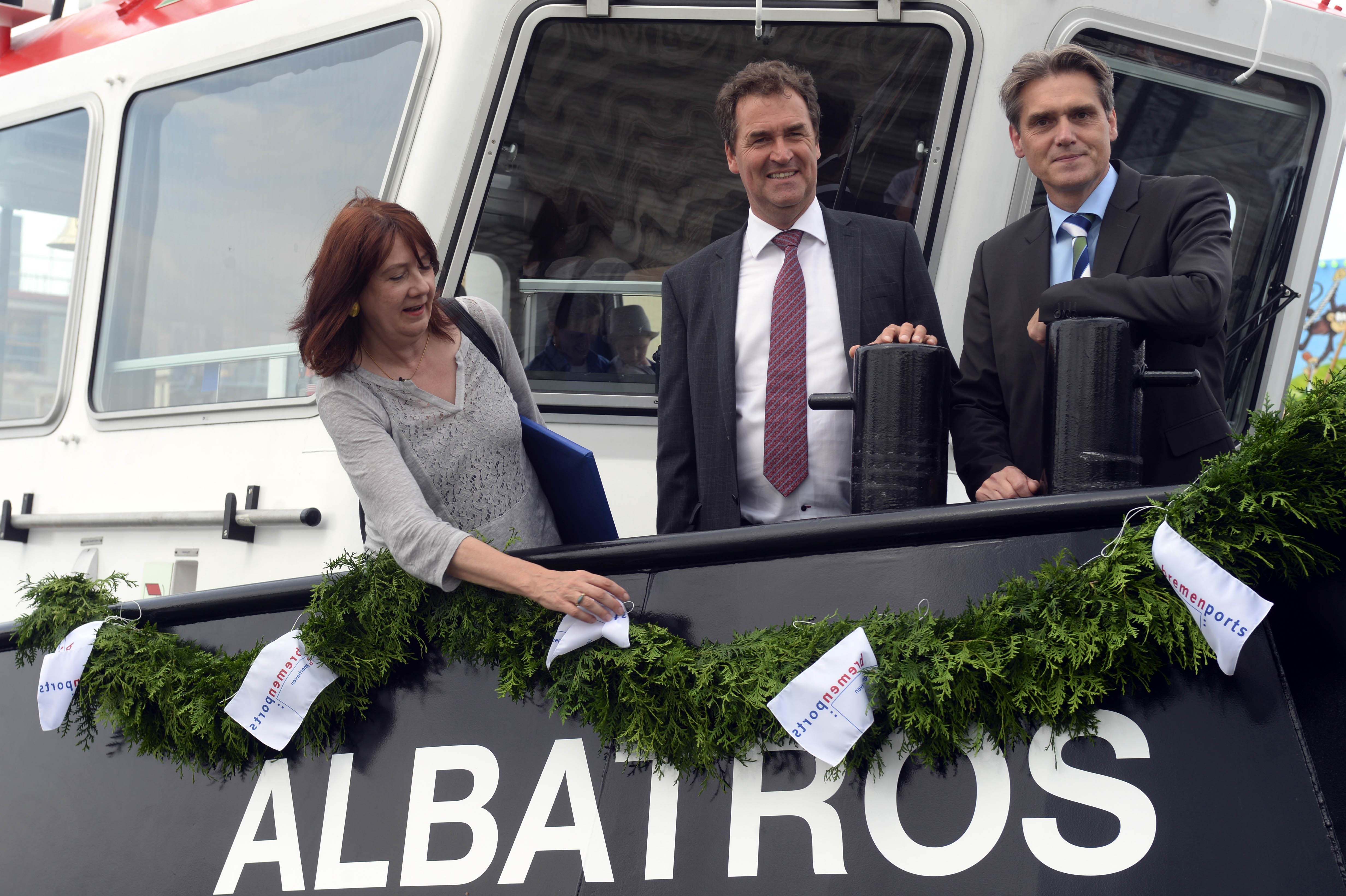 Schiffstaufe in Bremerhaven. Das Foto zeigt die Taufpatin Karoline Linnert mit Frank de Lange von der niederländischen Bauwerft Damen Shipyards (Mitte) und bremenports-Geschäftsführer Robert Howe. Die Flasche zersprang auf Anhieb – so soll es sein