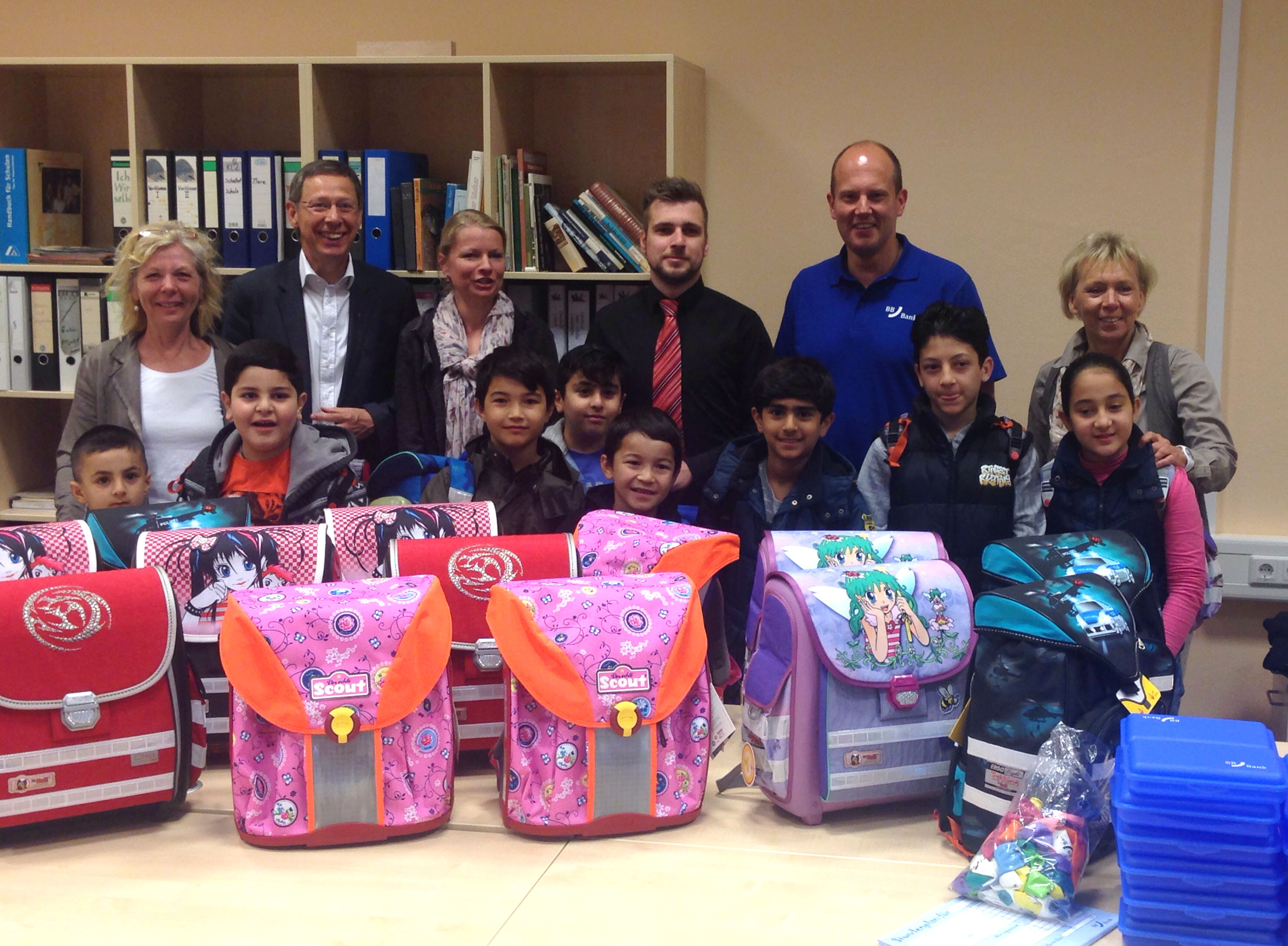 Schulranzenübergabe von Bürgermeister Dr. Carsten Sieling an die Kinder des Vorkurses an der Düsseldorferstraße (v.l.: Schulleiterin Dorothea Ilsen, BGM, Vorkursleiterin Kerstin Decker, Marcel Kuzyk (Deutsches Kinderhilfswerk), Lars Fischer (Leiter der Bremer Filiale der BBBank), Sabine Pajer (Verwaltungsanstellte der Schule))