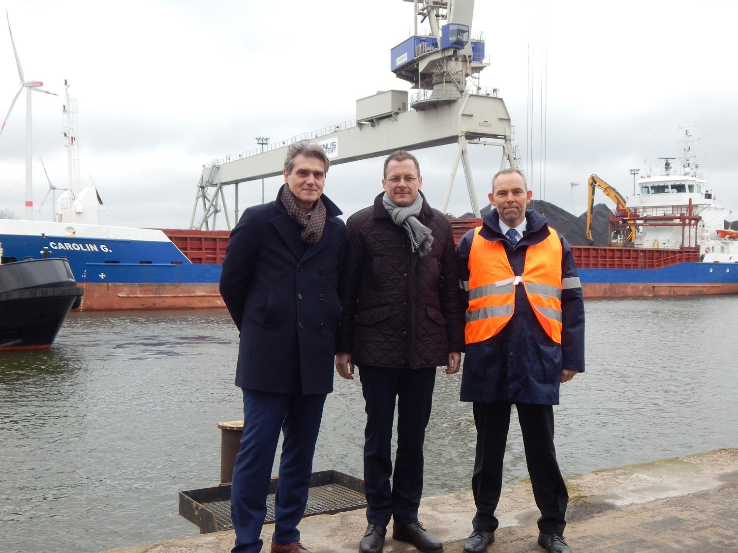 Senator Günthner beim Rammschlag im Industriehafen zusammen mit Robert Howe (li.), Geschäftsführer von bremenports GmbH & Co. KG, und Michael Appelhans, Geschäftsführer von Weserport GmbH