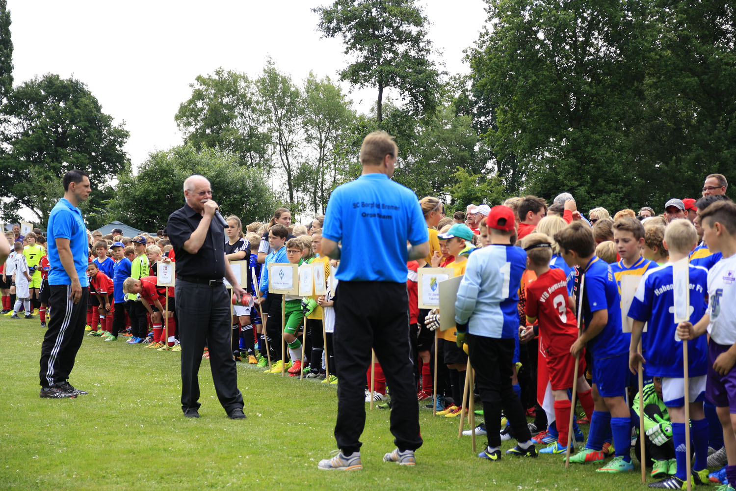 Senator Mäurer begrüßt die Kinder, die am 25. Karl-Schmidt-Cup teilnehmen; mit im Bild: Hajo Hilken, erster Vorsitzender des SC Borgfeld und Jugendleiter Thomas Kaessler (von links)