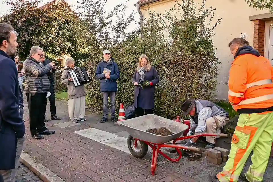 Senatorin Dr. Maike Schaefer bei der Verlegung der Stolpersteine in Hemelingen durch Gunther Demnig. Für die musikalische Umrahmung sorgte Ortrud Staude (Akkordeon).
