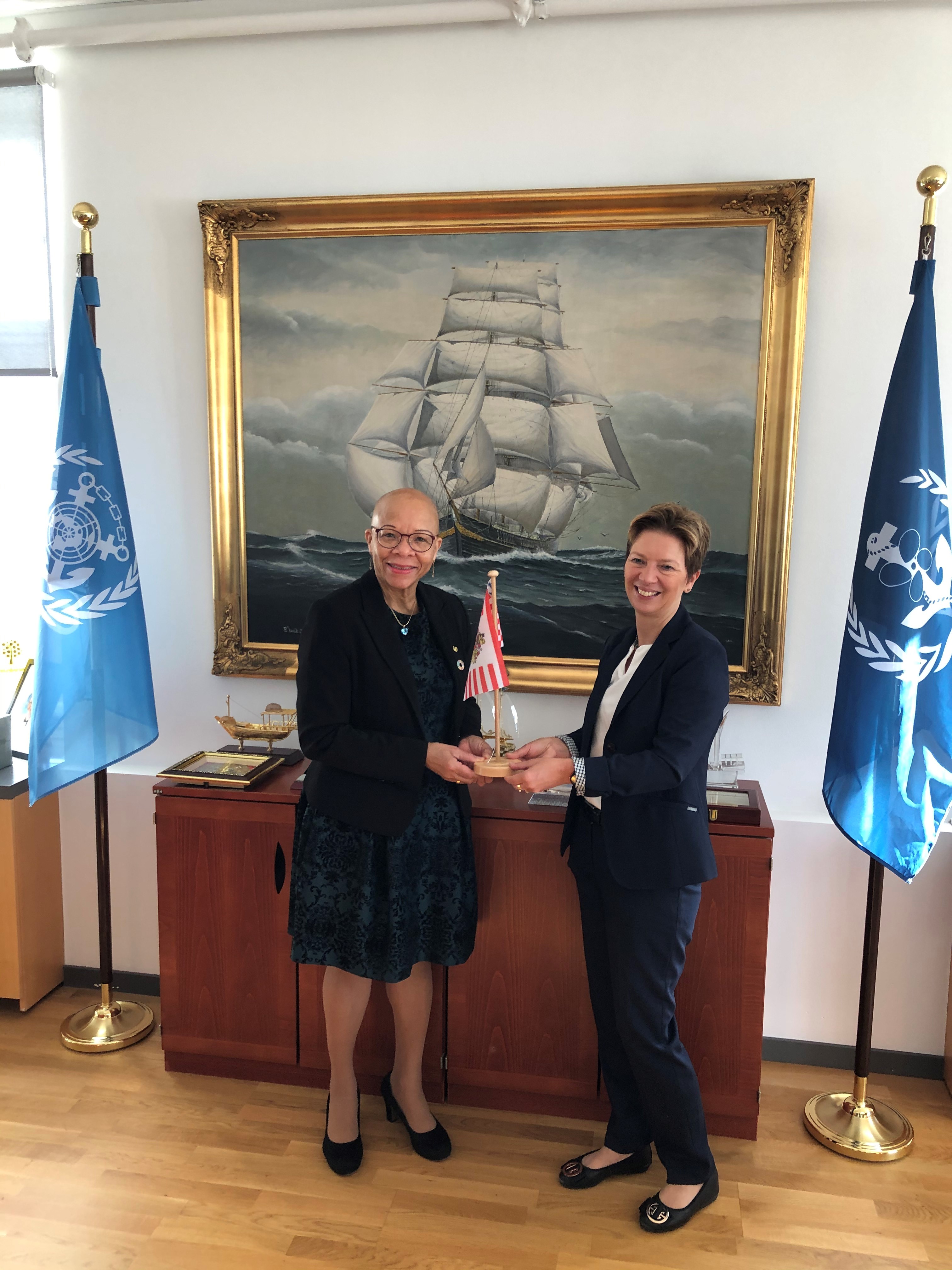 Senatorin Dr. Schilling (rechts) überreicht der Universitäts-Präsidentin Dr. Doumbia-Henry die Speckflagge