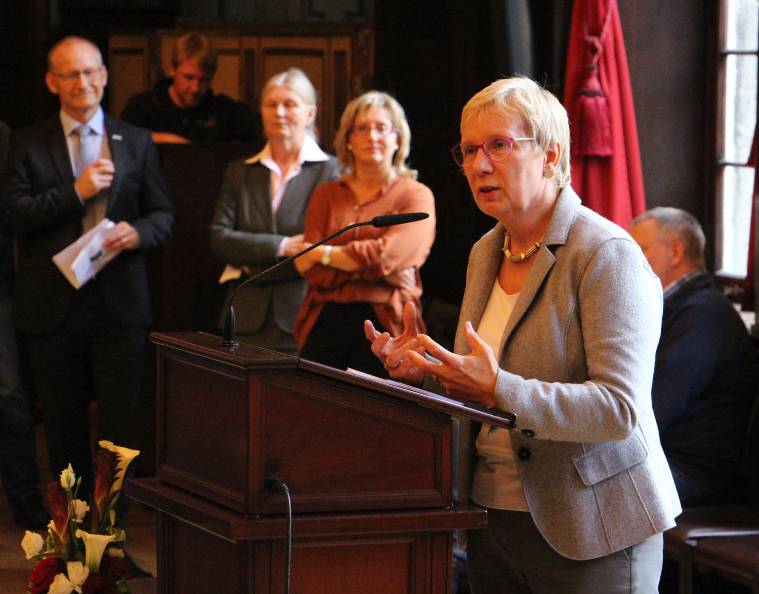 Senatorin Quante-Brandt begrüßt die Mitarbeiterinnen und Mitarbeiter der beiden Bremer Landesämter im Festsaal des Bremer Rathauses