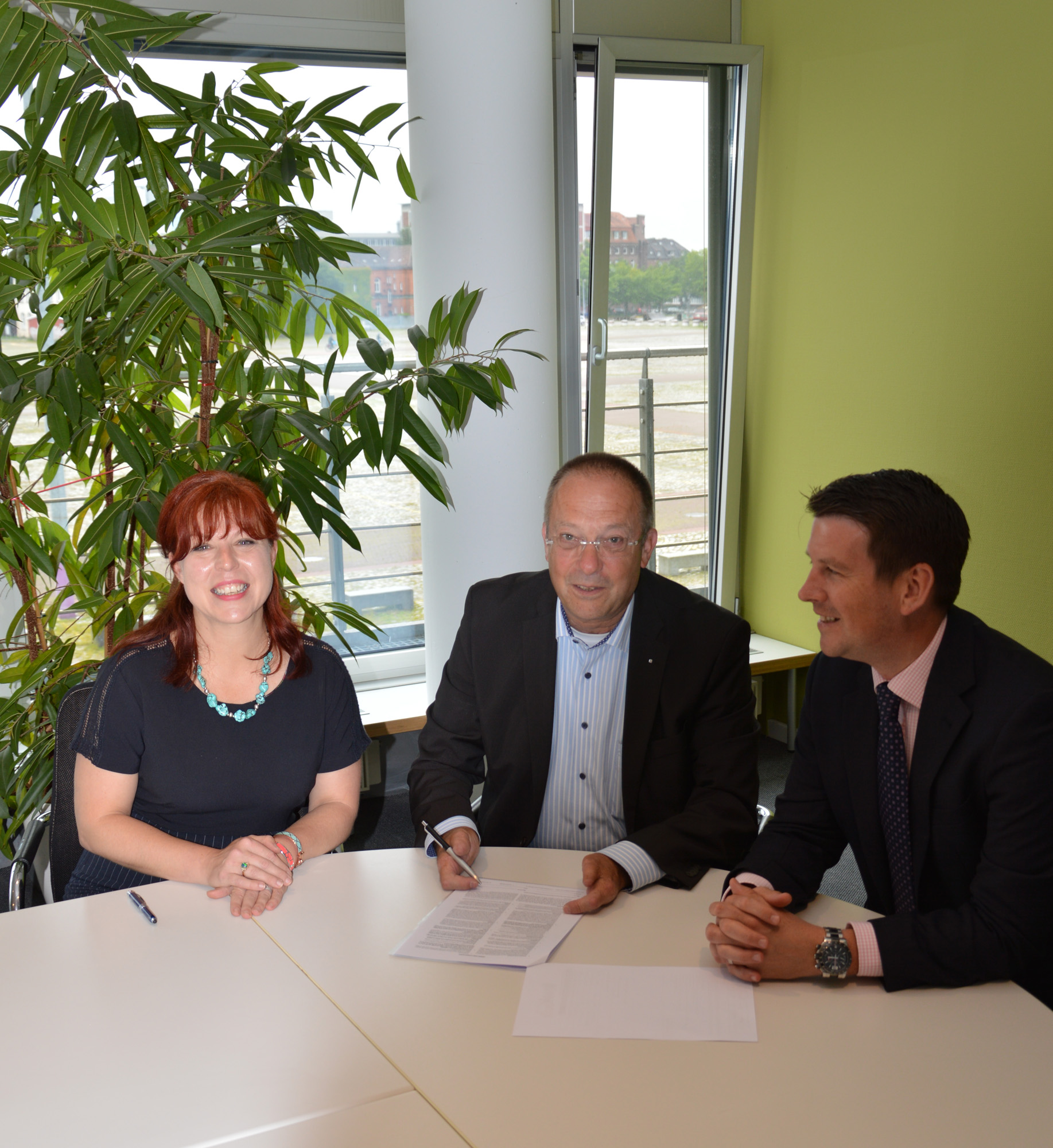 Sie wollen viele tausend Fachbesucher zur "BreakBulk Europe 2018" nach Bremen holen: Alli McEntyre (links) und Mark Rimmer (rechts) vom Veranstalter Breakbulk Events & Media mit Michael Skiba, Marketingleiter von bremenports