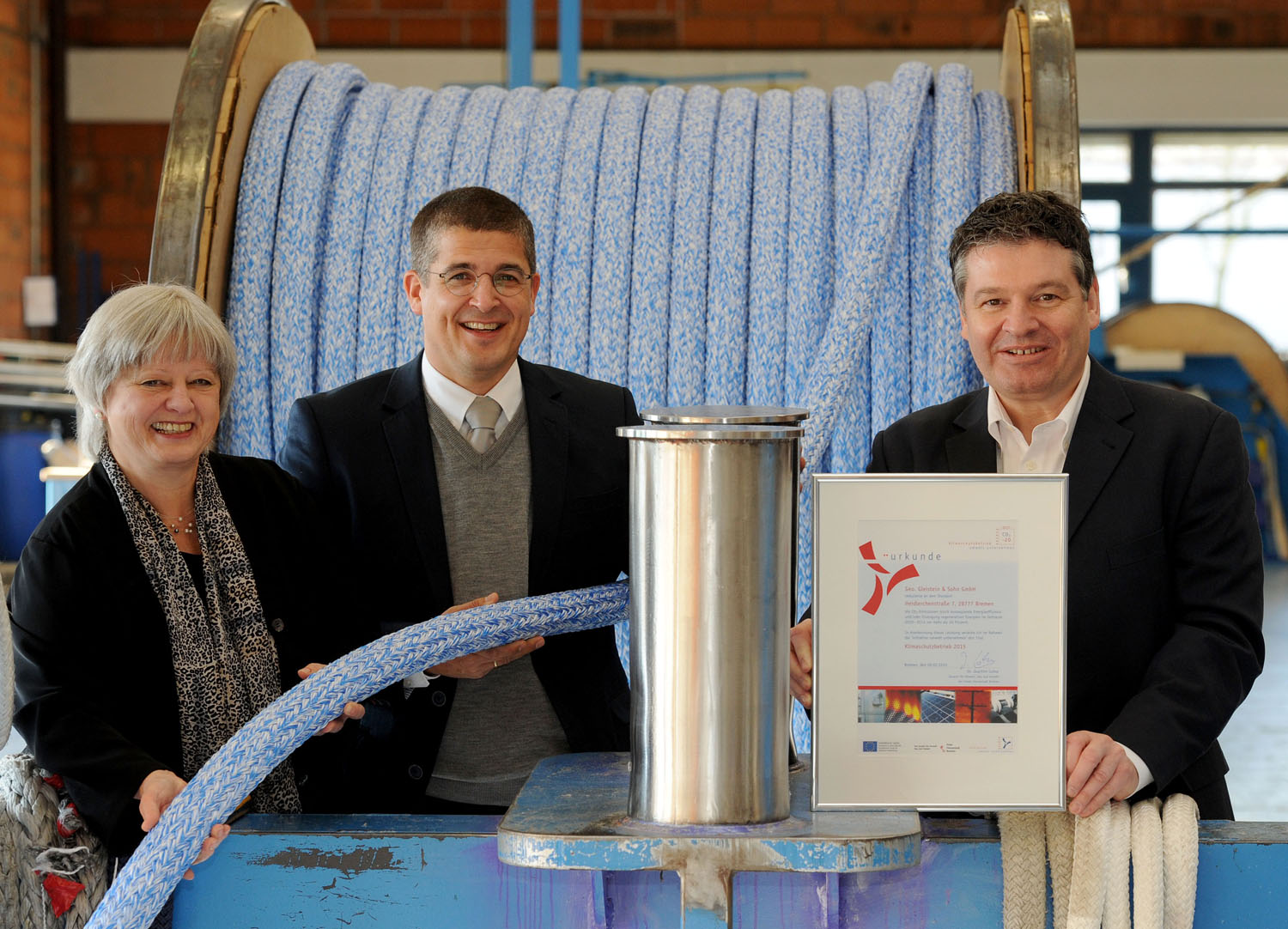 Staatsrätin Gabriele Friderich beglückwünscht die beiden Geschäftsführer von Geo. Gleistein Thomas Schlätzer und Klaus Walther (v.l.n.r.) zur Auszeichnung zum "Klimaschutzbetrieb CO2-20" 2015